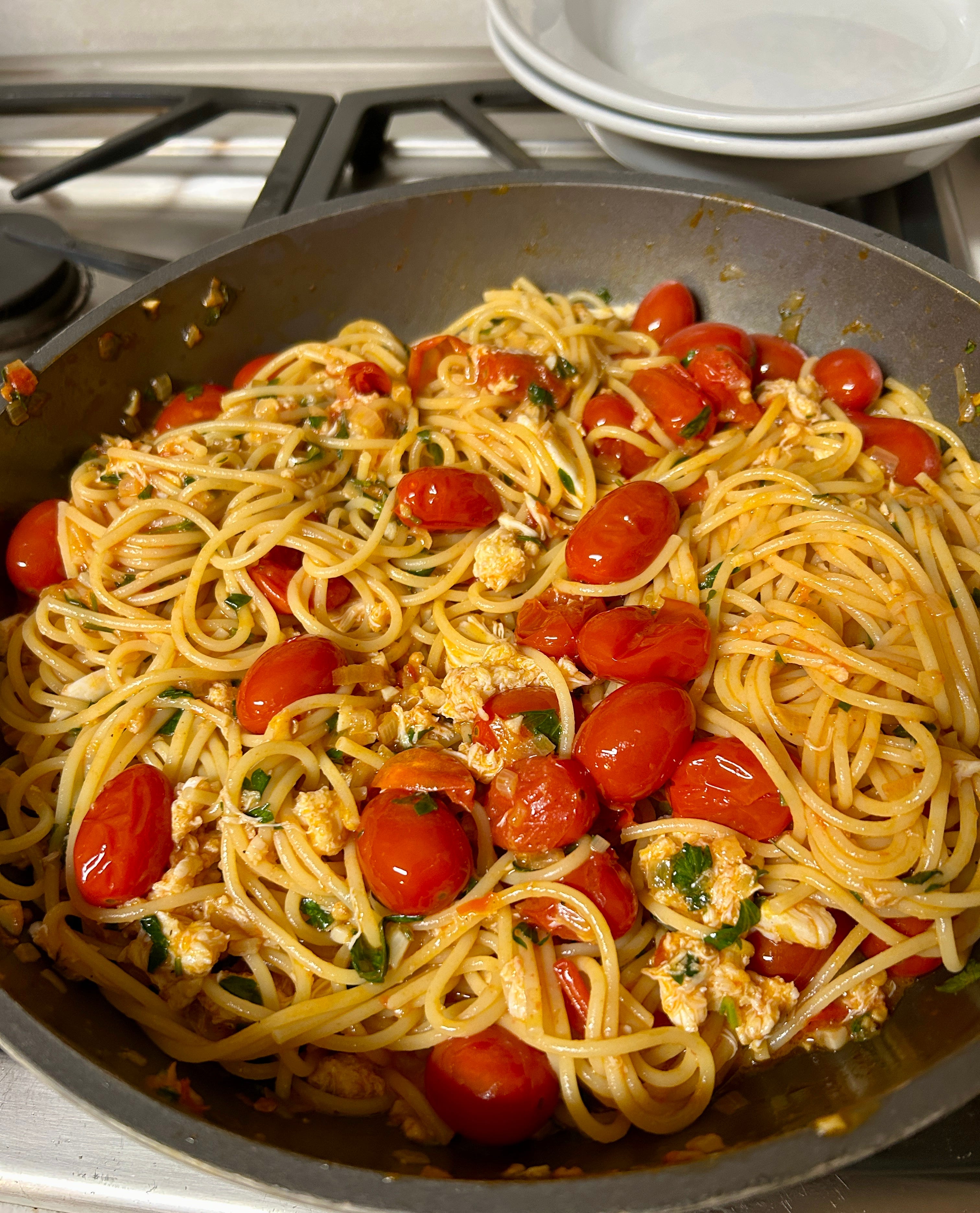 I’ve been cooking a lot. But enjoying cooking, not forcing it. For New Year’s Eve a fairly simple crab pasta and roasted asparagus.