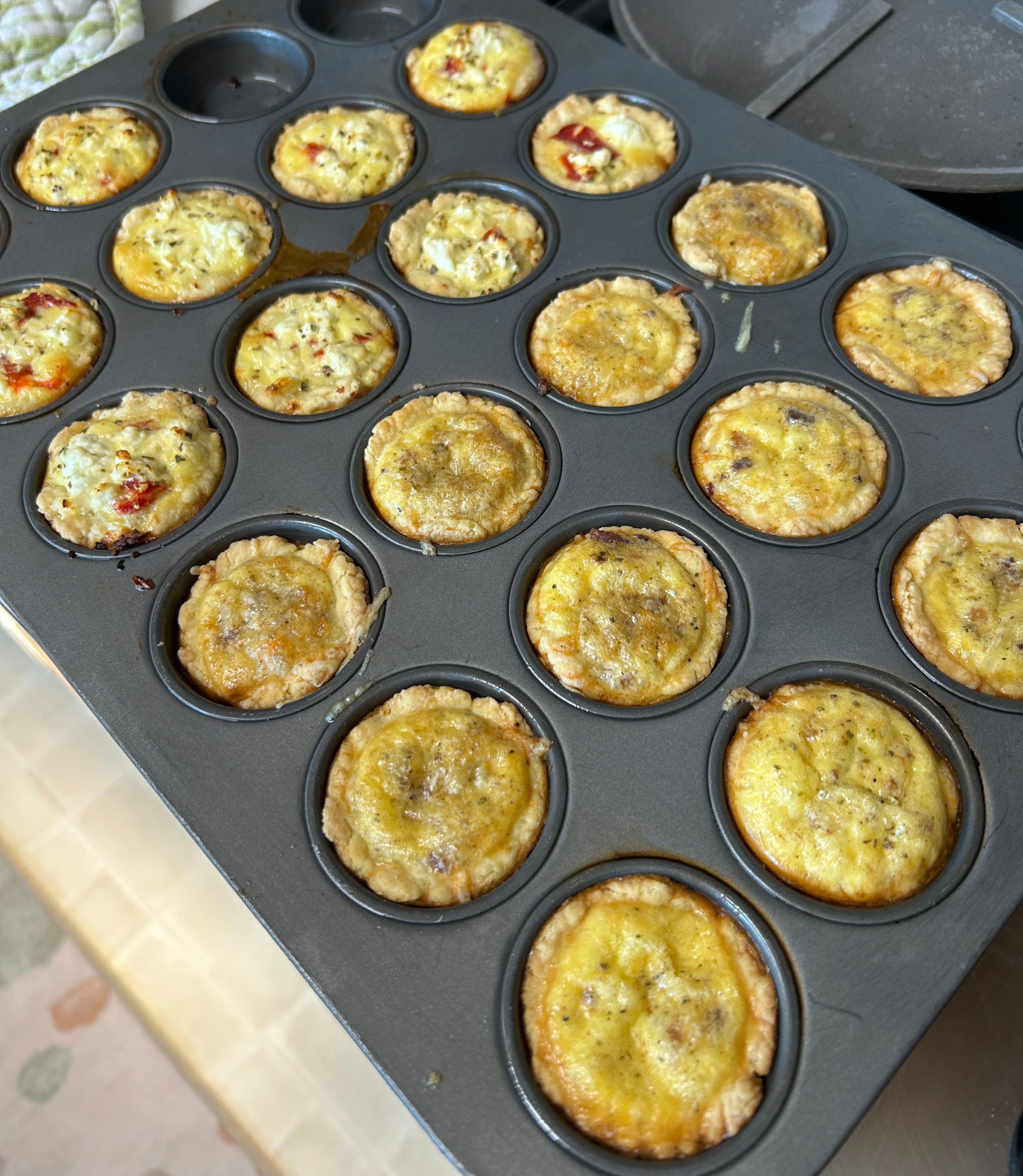 Mini quiches for our monthly business meeting at Friend’s worship. I used filling from one recipe, crust from another. I made bacon Swiss and feta/roasted red pepper.